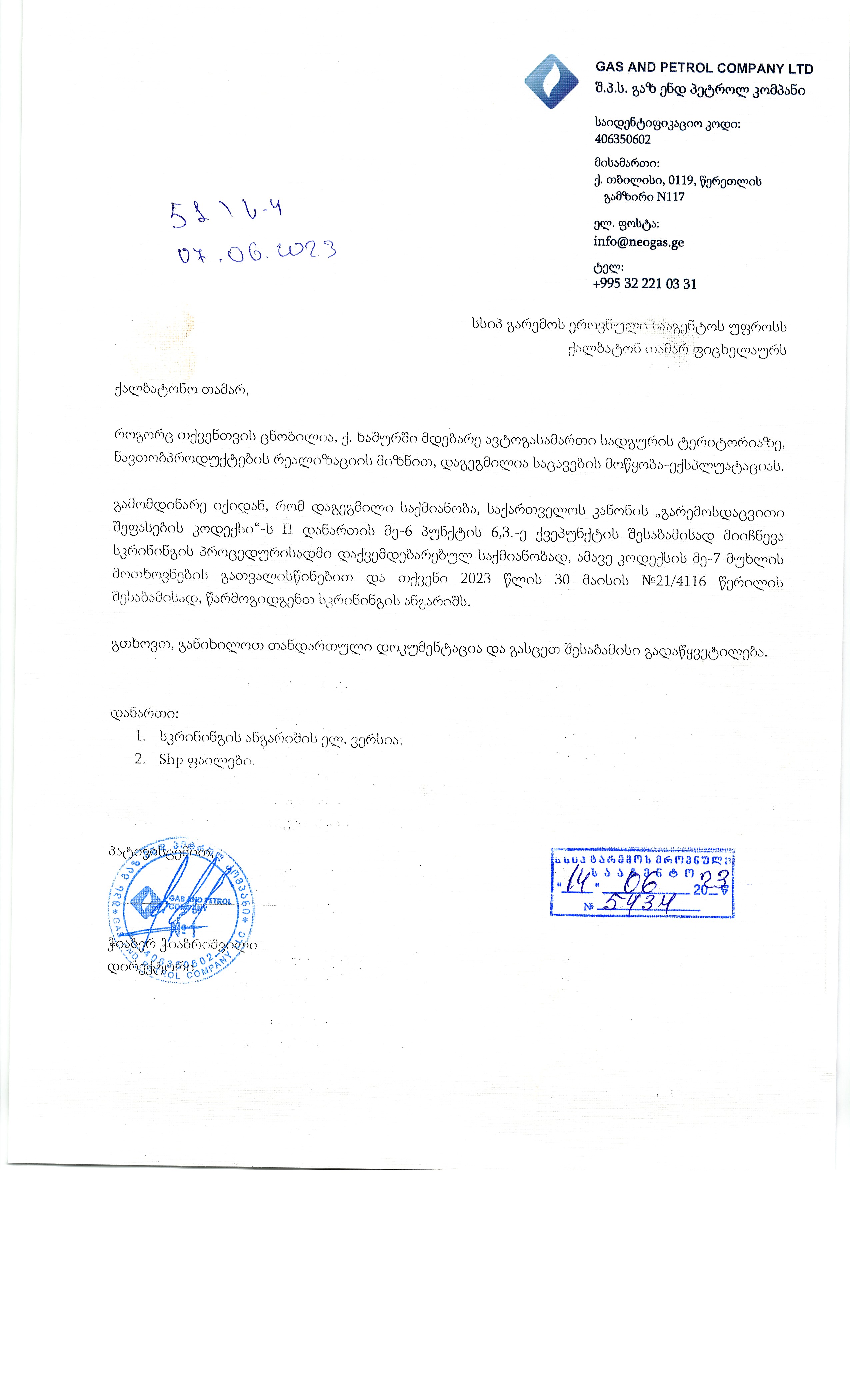 სკრინინგის განცხადება - ქ. ხაშურში, შპს. „გაზ ენდ პეტროლ კომპანის" ნავთობპროდუქტების საცავის (ავტოგაასამართი სადგური) მოწყობისა და ექსპლუატაციის პროექტი